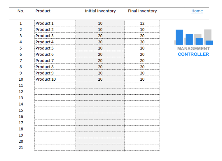 The final inventory is calculated automatically for each product, allowing you to track changes in real time.